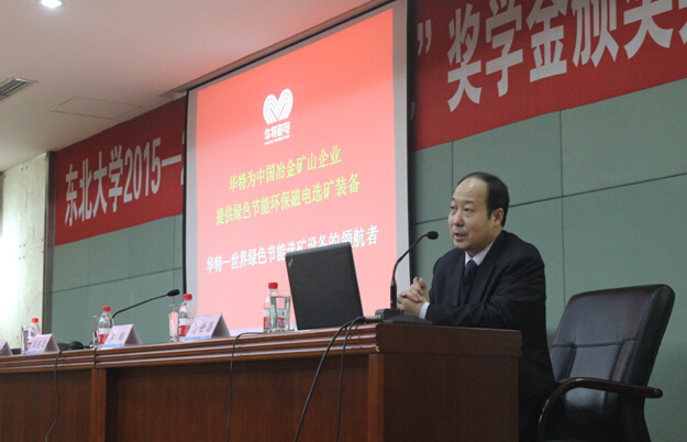 2015年12月25日,東北大學“華特磁電”獎學金頒獎典禮于東北大學漢卿會堂舉行,這是自去年設立華特獎學金以來第二次頒獎。公司董事長兼總裁王兆連、技術中心電器部經理劉世昌、電器工程師張永信,東北大學校友總會、校董會、基金會管理辦公室主任李鶴、資源與土木工程學院黨委副書記兼副院長劉維、獲獎學生及礦物加工工程專業學生代表等參加了會議。